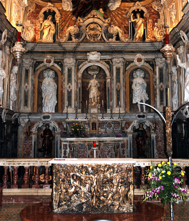 Im Inneren der Wallfahrtsstätte, in der Kapelle San Vito, die mit lokalem Marmor und Stuckstatuen von Orazio Ferraro (1624-1628) wertvoll ausgestattet ist, befindet sich im Zentrum eine Statue des Heiligen. Das kostbare Werk wurde 1587 im „gaginesca“ Stil erbaut und hat in seinem Sockel Episoden aus dem Leben des Heiligen in dieser Stadt eingemeißelt. Die besondere Abschleifung der Füße ist auf den hundertjährigen Brauch der Pilger zurückzuführen, die Füße zum Zeichen der Verehrung zu küssen.