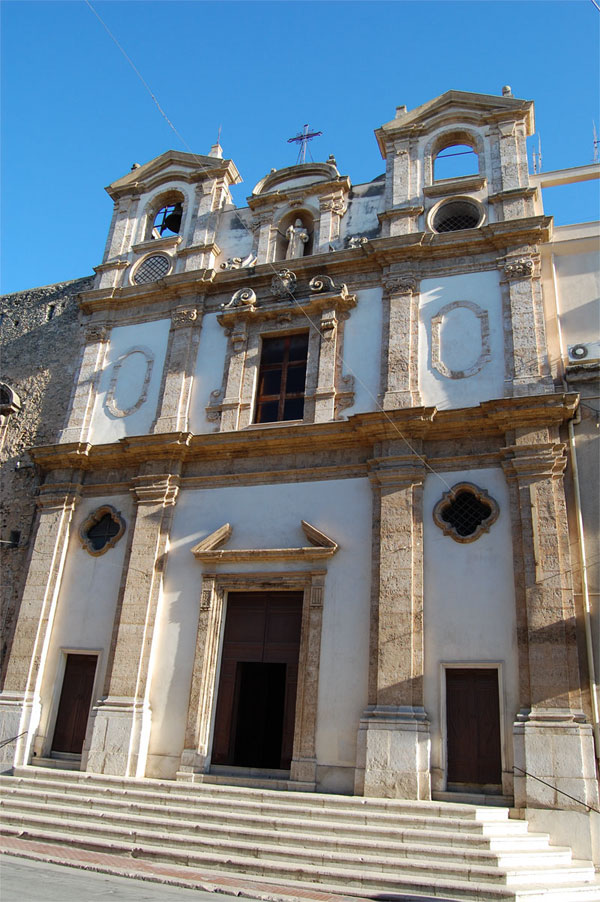 Built in 1615 on the site of the abolished Ospedale degli Incurabili (hospital for incurable people), it took on its present appearance in 1689 following work by Giovanni, Francesco and Cristoforo Fica from Trapani. The façade with its robust framework dates back to 1782. The splendidly decorated inside is a perfect expression of Alcamo Baroque style. Red marble columns, from the quarries of Mount Bonifato, divide the inside into a nave and two side aisles in the shape of a Latin cross with a large transept and rectangular apse in which is found a large canvas depicting the Santa titular, by Giuseppe Felicia from Trapani (1701). The dense plastic-pictorial decoration is brightened by extremely refined stuccoes by Vincenzo and Gabriele Messina and by valuable frescoes by Antonio Grano.