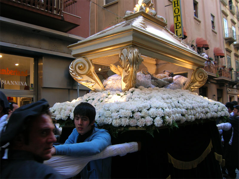 Misteri procession composed of eighteen statue groups, made from wood, cloth and glue from the XVII and the XVIII centuries, recalling episodes from the passion of Christ, followed by Gesù nell’urna and by the statue of the Addolorata – Our lady of sorrow. Entrusted to the “maestranze” and carried on the shoulder, they parade from 14.00 on Good Friday until Saturday morning.