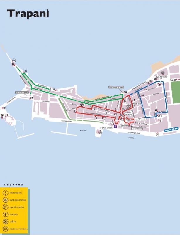 C: Via Libertà, Corso Vitt. Emanuele, Via Carolina, P.zza Scalo d’Alaggio (25), Via Torre Ligny (26), Via delle Sirene (27, 28), Via Borea, Corso Vitt. Emanuele, Porta delle Botteghelle (29), Via Mura di Tramontana, P.zza Mercato del Pesce (30)