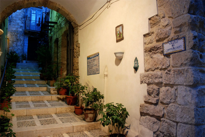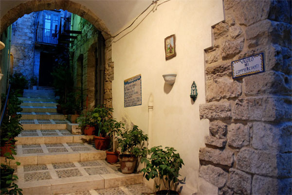 Vicoli e cortili caratterizzano l’antico nucleo abitativo della città, articolandosi in percorsi labirintici e tortuosi, di chiara matrice islamica. Oltre a vie di percorrenza, i vicoli sono stati, sino alla fine degli anni cinquanta, veri  luoghi comunitari nei quali le famiglie si incontravano e discutevano di tutto ciò che oggi può essere argomentato in uno spazio pubblico. Ognuno di essi ha una storia e un significato, alcuni si riferiscono alle tradizioni popolari come i vicoli dei Proverbi e delle Origini, altri ai Ceti o alla Festa del Crocefisso. Percorrerli significa vivere un’emozionante esperienza a contatto con la storia e le tradizioni della città.