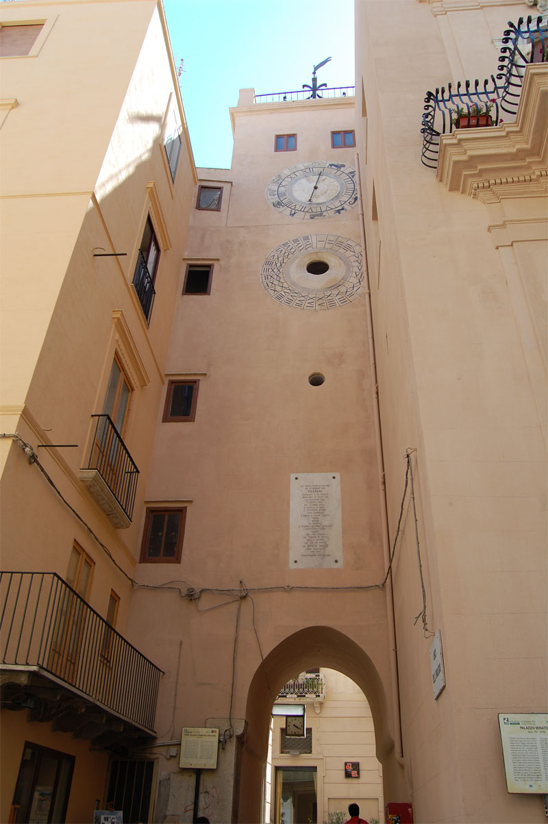 Con la Porta Oscura sottostante la Torre dell’Orologio, costruita intorno al Trecento, segna il limite tra il nucleo originario della città fortificata e l’espansione ad ovest del periodo aragonese. La base della Torre ed il passaggio ad arco sottostante costituivano sin dalle origini di Trapani la porta più a nord della città fortificata.  A seguito dei lavori di costruzione della facciata del Palazzo Senatorio avvenuti nel 1678, anche la Torre subì delle trasformazioni, con l’accorpamento al Palazzo della stanza soprastante l’arco e la costruzione della scala interna in legno, per consentire l’accesso al vecchio orologio, sito nell’ultimo livello.