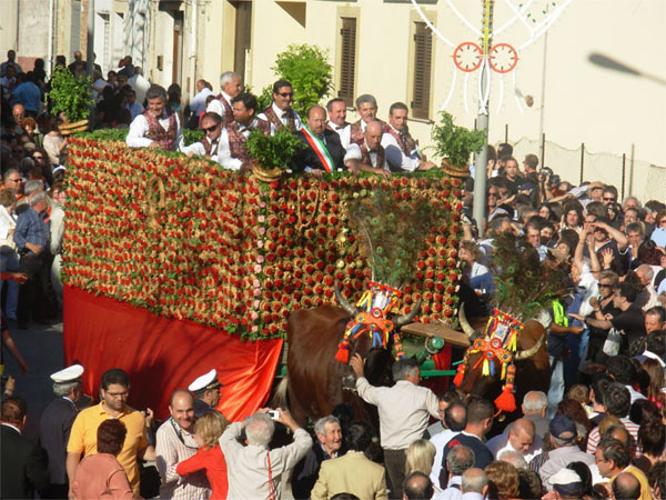 I solenni festeggiamenti durano diversi giorni e vi si intrecciano religiosità e folklore. Caratteristiche sono le sfilate che si snodano per le vie del paese: la "Cavalcata" con il Carro del vino e delle olive, da dove figuranti in costume, che rappresentano i vari ceti, lanciano buste di vino, olive, noccioline, e la sfilata della “Carrozza”, la carrozza del pane trainata da buoi inghirlandati, da dove vengono lanciati i Cuccidati, piccole ciambelle con i bordi frastagliati. In onore della Madonna i carri espongono ad ogni lato una vistosa M, detta Nomi di Maria.