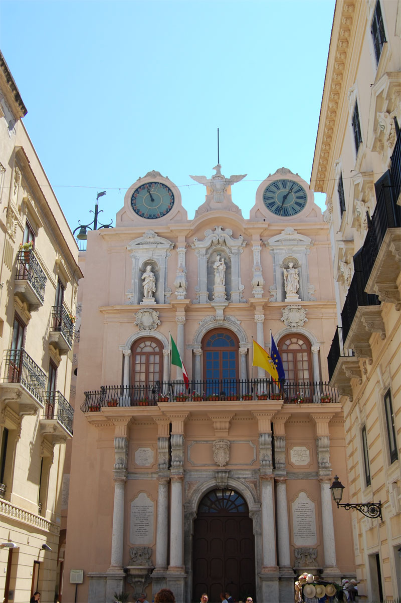 Negli anni a venire furono costruiti lo scalone, le stanze al secondo piano e la scalinata d’ingresso, e ancora la decorazione marmorea del prospetto con l’aggiunta di tre statue e delle due fontane del primo ordine. Sopra il cornicione del terzo ordine vengono collocati un’aquila, due scudi e tre grandi vasi, mentre all’interno si realizzano opere di consolidamento. Nelle nicchie del terzo ordine sono collocate, al centro la statua della Madonna di Trapani, a sinistra di San Giovanni Battista e, a destra, di Sant’Alberto, opere di Giuseppe Nolfo (1701-02). Nel 1828 furono aggiunti due cassoni per l’orologio e il datario. Oggi è sede di uffici comunali.