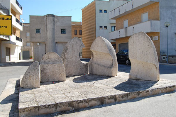 Scultura progettata da Paolo Schiavocampo nel 1979, formata da 12 elementi in travertino, di cui 5 in forma ovoidale, poggiata su un pavimento in mattoni quadrati, mt. 5.95 x mt. 5.95 x h. mt. 2.00; poiché, come lui stesso precisa “una forma sola avrebbe difficilmente potuto soddisfare la possibilità di riempimento di uno spazio molto grande”, e distingue gli ambiti destinati ad assolvere  funzioni diverse: “zone di riposo per leggere un libro, e/o trovare ombra e tranquillità”.